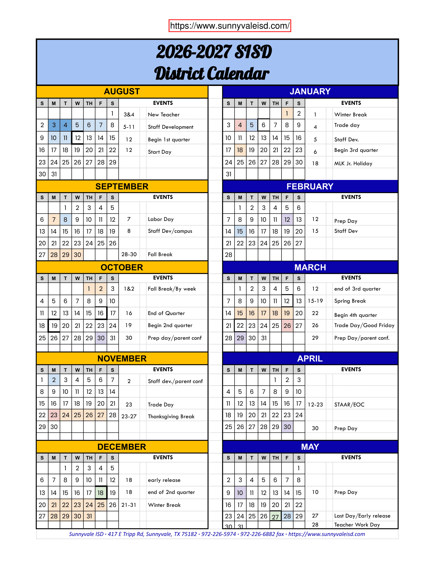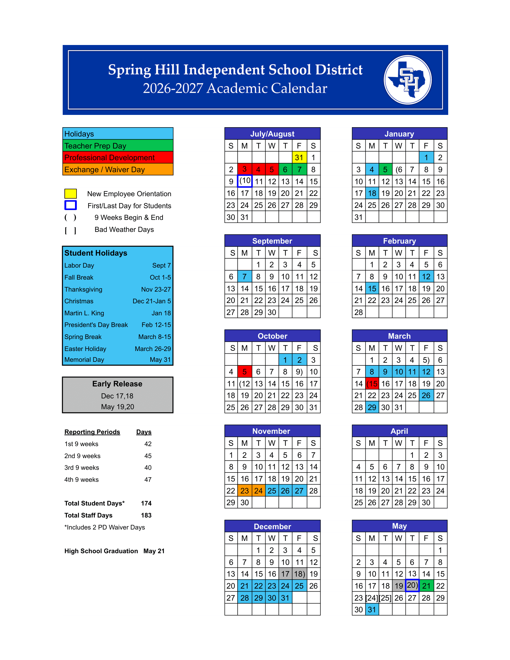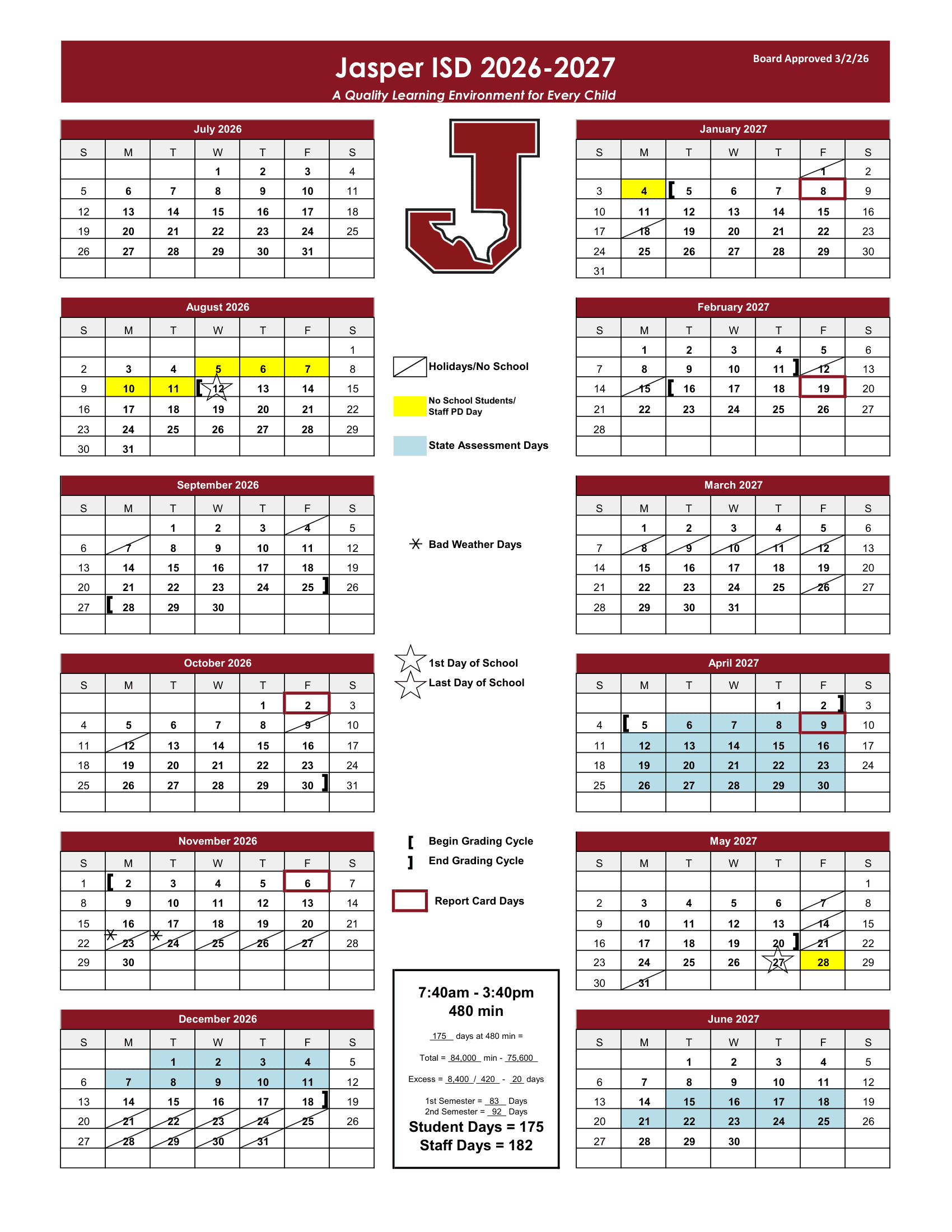 Official School Calendar for Academic Year 2026–2027